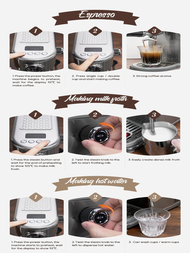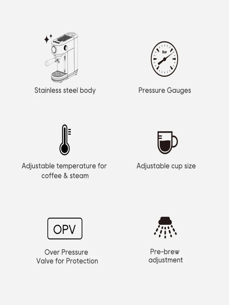 - FULLY PROGRAMMABLE CONTROL: Unleash your inner barista with adjustable settings for coffee volume (single/double shots), water temperature (90–95°C hot, 25°C cold), and pre-infusion time (0-10 seconds).