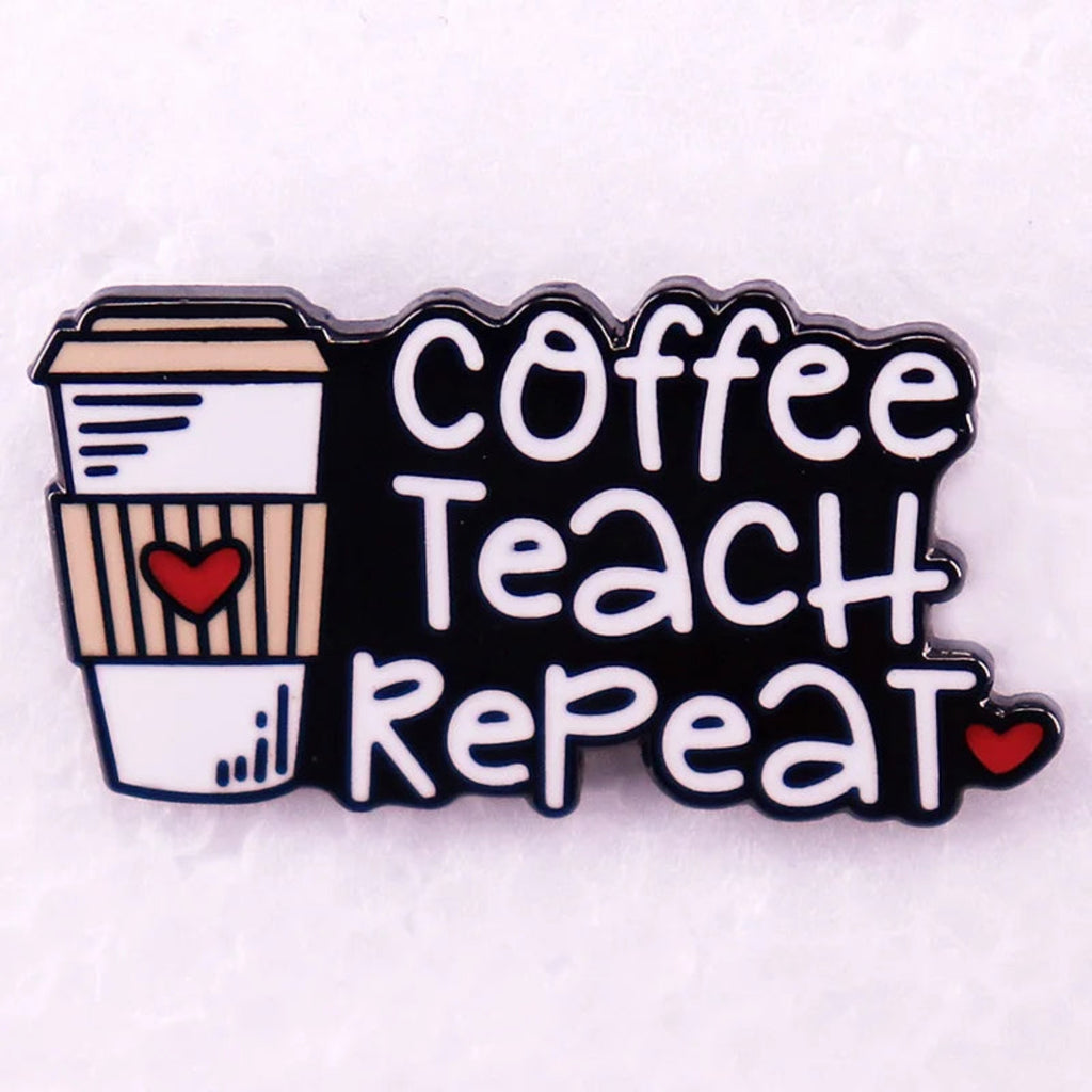 JAZZUP Coffee Teach Repeat Enamel Brooch Pin - The Ultimate Teacher Accessory